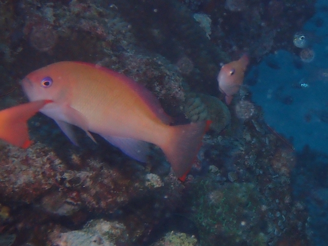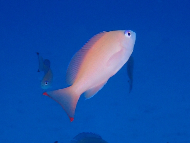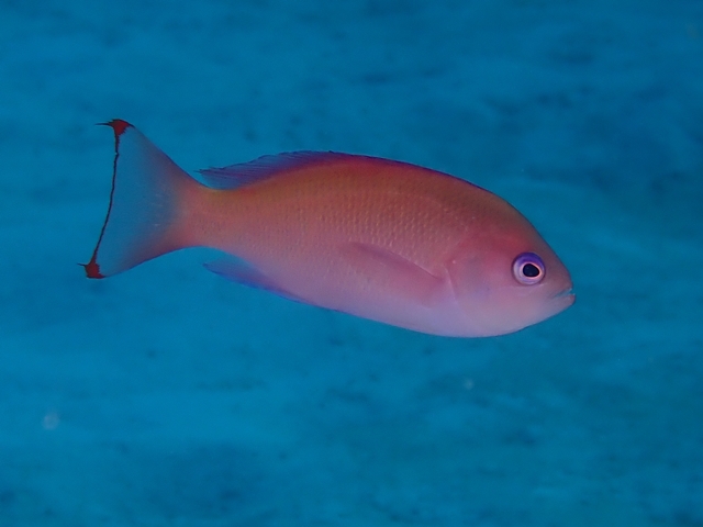 似ているアカオビハナダイのメスは尾ビレの上下の縁の赤色の斑が繋がりません。