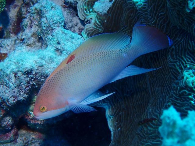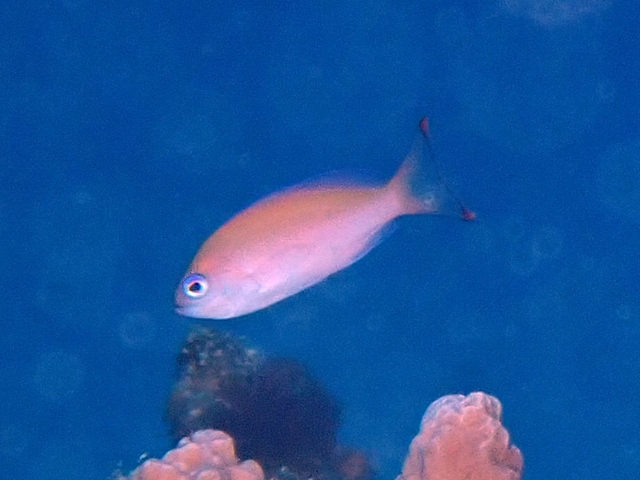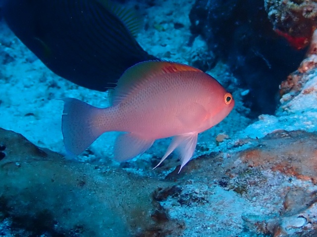 体色は淡いピンク色で、オスは背ビレ中央あたりに赤い斑点があります。