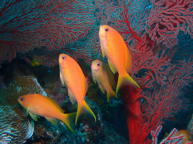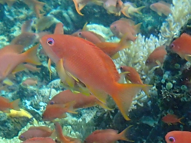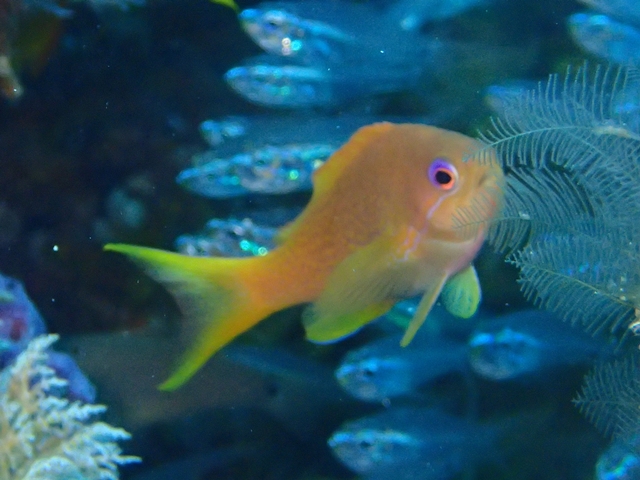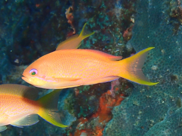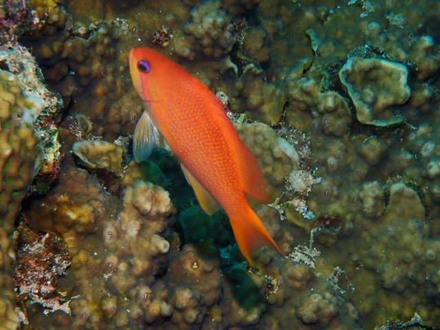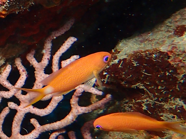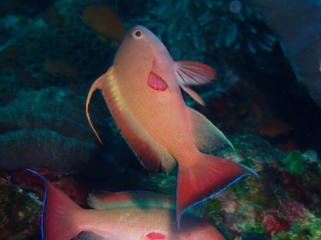 胸ビレに大きな赤色の斑があります。 メスや幼魚の体色は橙色で、