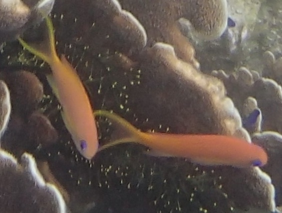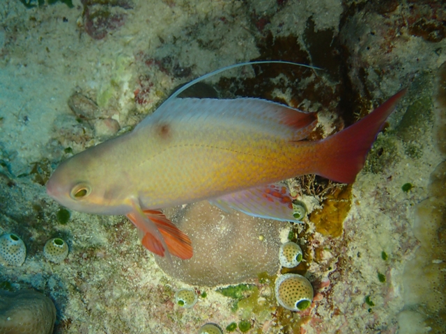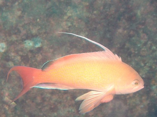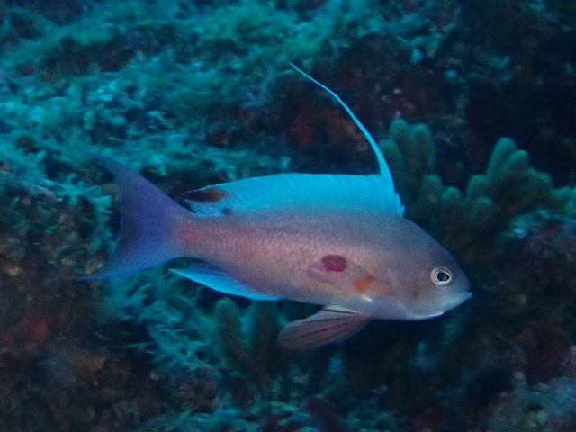 体色はオスは紫色を帯びたような赤色で、背ビレの第3棘が糸状に伸びます。