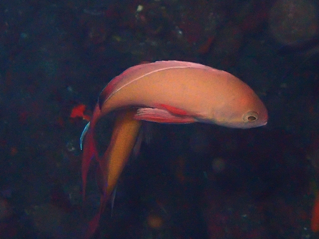 オスとともに眼の下から胸ビレ基部までオレンジ色の帯が入ります。