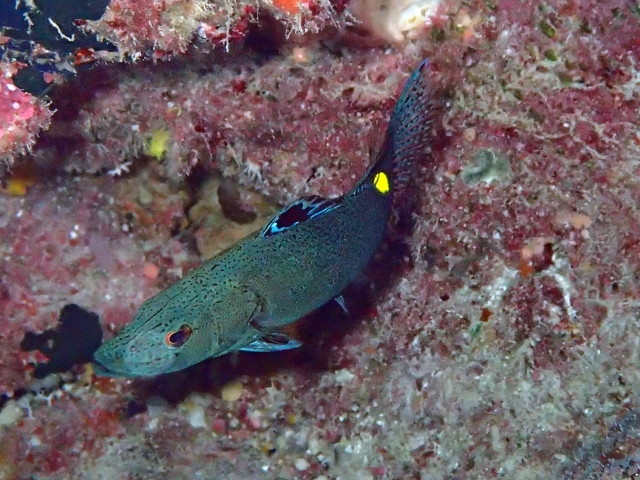 体色は暗緑色で、尾柄上部に黄色の斑が目立ちます。