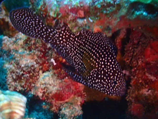 背ビレ軟条部に眼状斑があり、体側には白色の小斑がびっしりとあります。