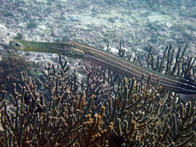 その特徴から遠くからでも分かりやすいのですが、海藻など周りの色に擬態して