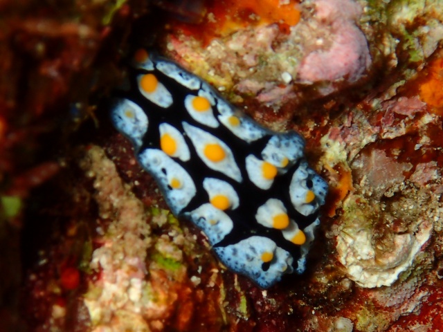 背面にひし形模様、周縁沿いに半円型の暗青色の模様が並び、