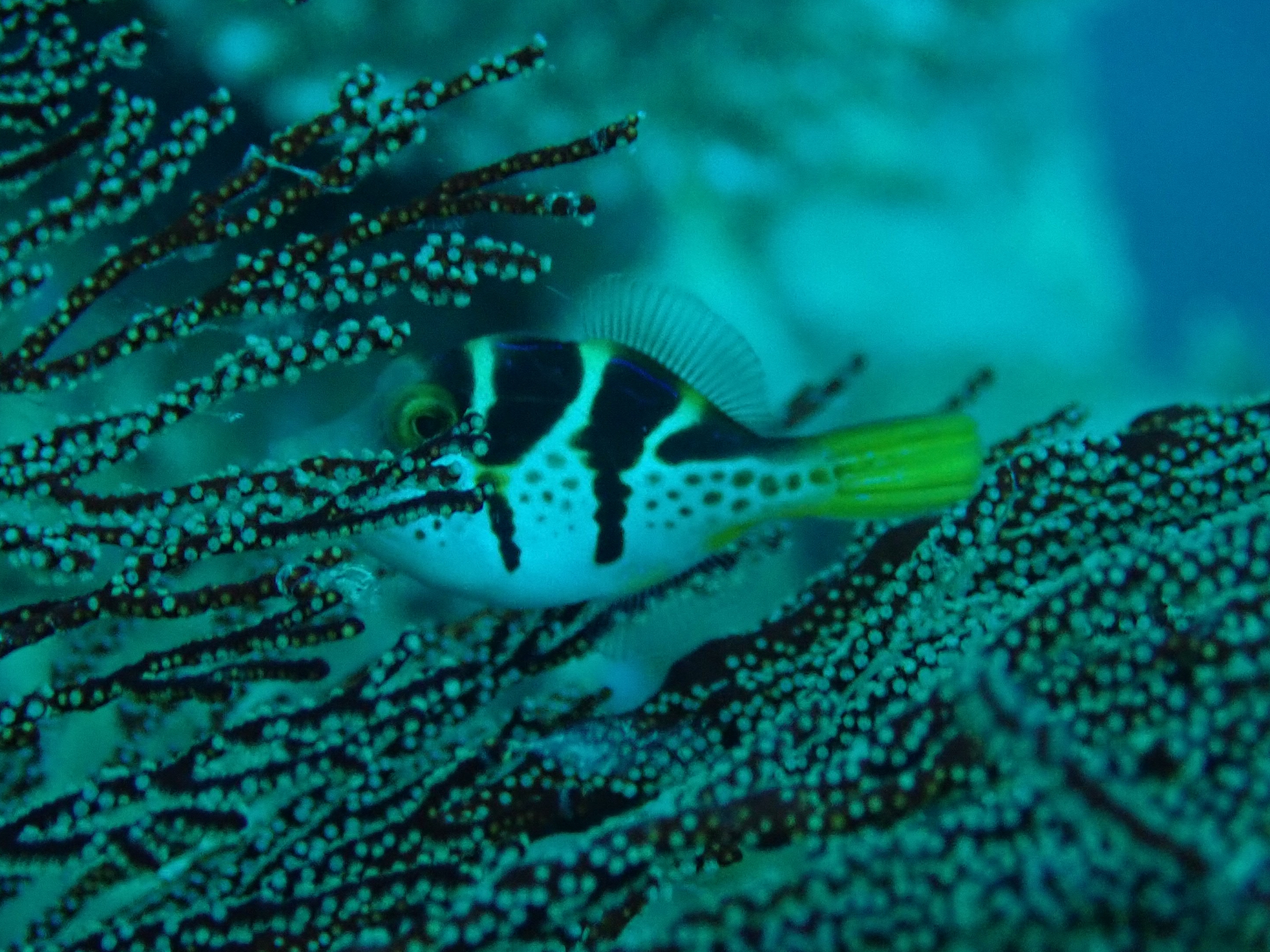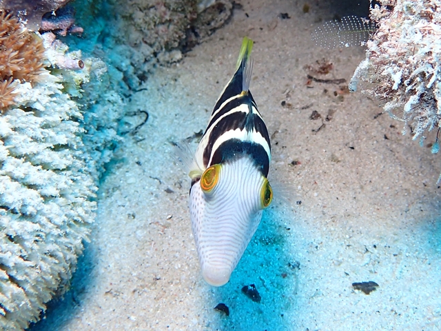 横帯がオレンジ色で縁取られているのがハナキンチャクフグです。