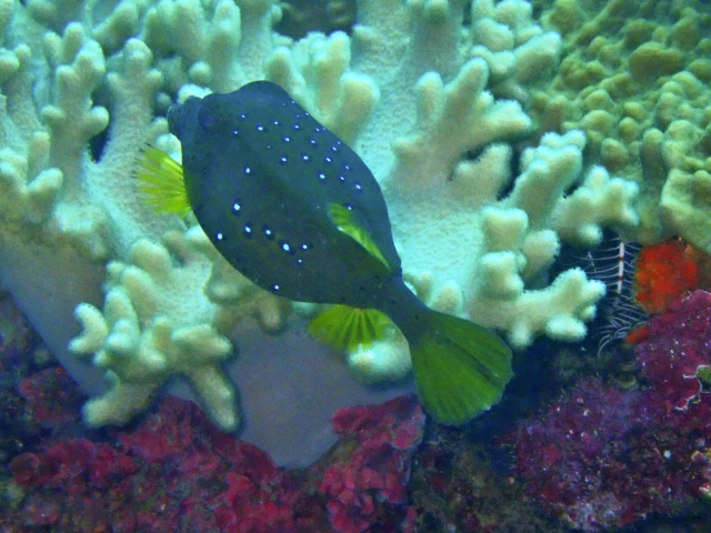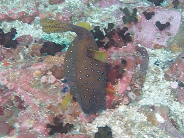 雌は、褐色で、黒で囲われた白斑が点在します。尾びれにまで斑があります。