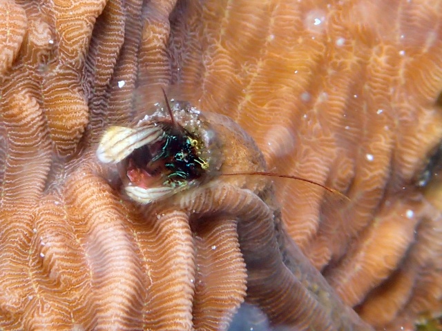 カンザシゴカイ類が作った石灰質の棲管に住み、顔やはさみ脚だけを出しています。