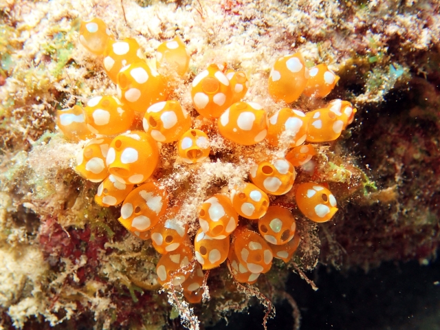 1つ5mm〜1cm程度の個体が群体を作って岩陰などに着きます。