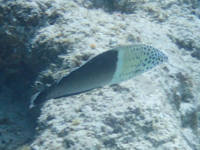 幼魚の頃は白っぽい体色で、頭部に黒色斑が多数散在、