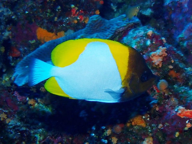 胴と尾ビレは白色、頭部は黒褐色、頭部の後ろ、背ビレ、尻ビレが黄色です。