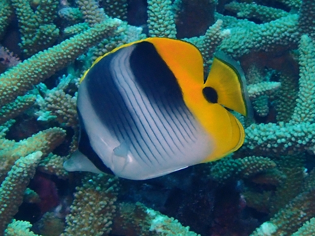 似ているサドルバックバタフライフィッシュは背中側の黒帯が細く、その間に黄色部分があります。