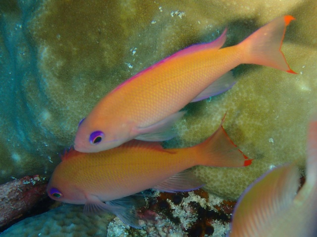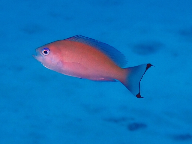 似ているアカオビハナダイのメスは尾ビレの上下の縁の赤色の斑が繋がりません。