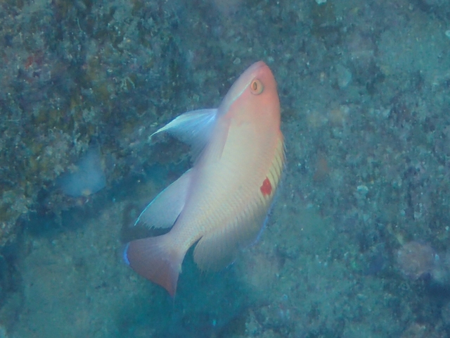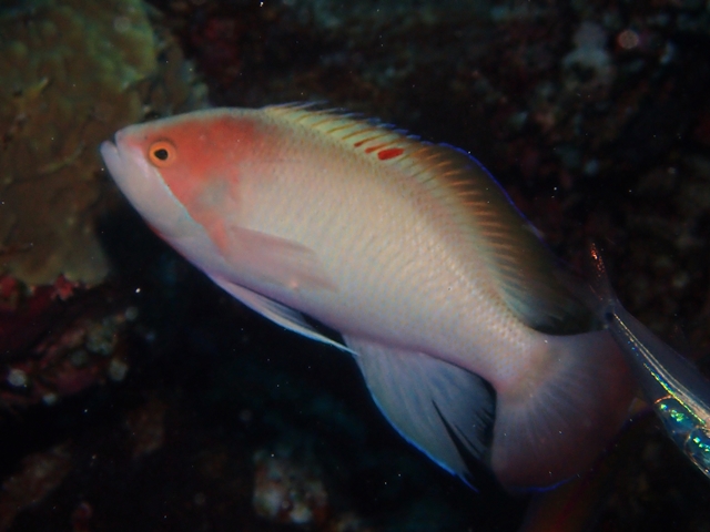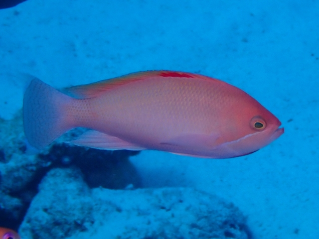 体色は淡いピンク色で、オスは背ビレ中央あたりに赤い斑点があります。