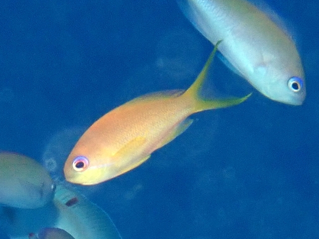 オスとともに眼の下から胸ビレ基部までオレンジ色の帯が入ります。