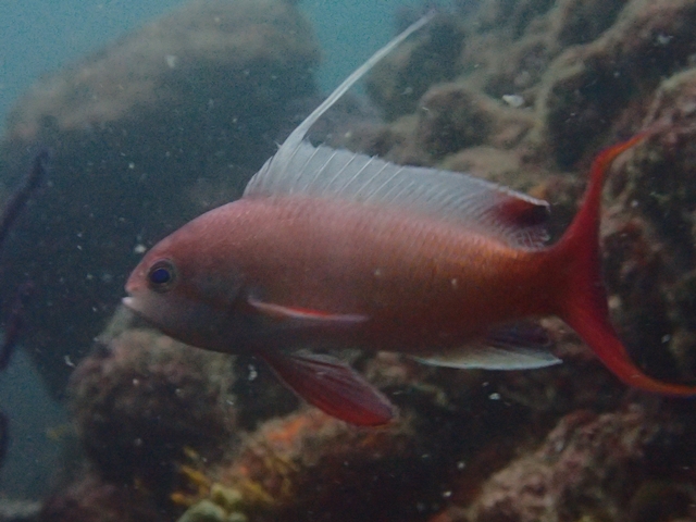 体色はオスは紫色を帯びたような赤色で、背ビレの第3棘が糸状に伸びます。