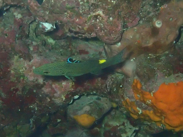 体色は暗緑色で、尾柄上部に黄色の斑が目立ちます。