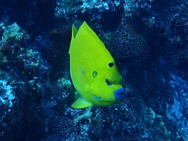 幼魚も同じように鮮やかな黄色の体色で、眼を通る黒色の横帯が通っています。
