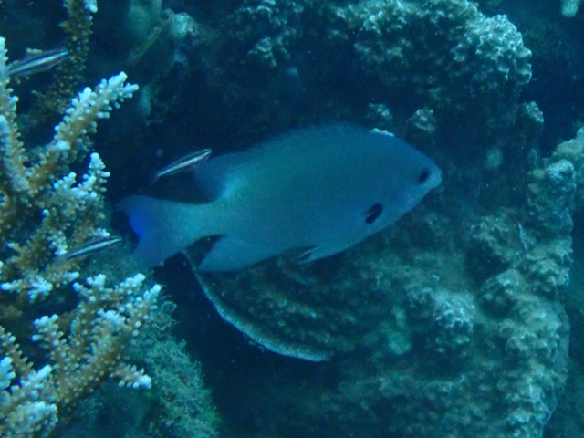 ニセモンツキスズメダイにも同じように黒色斑がありますが、