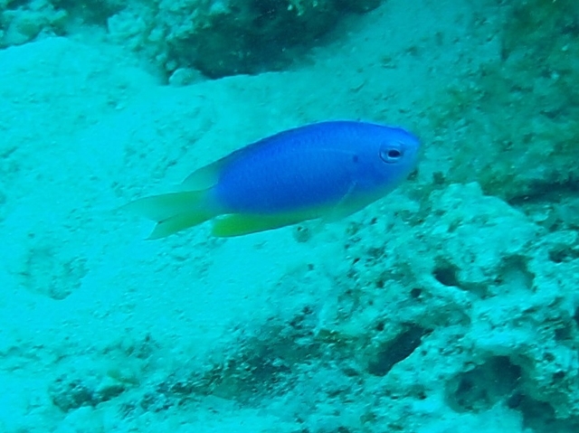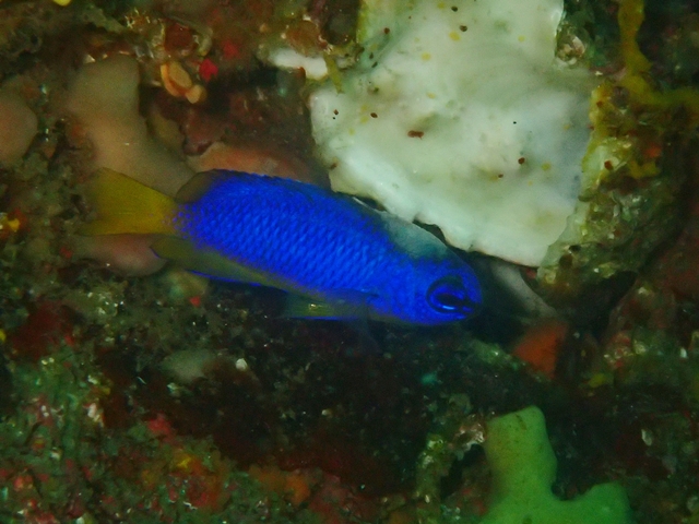 体色はコバルト色で、尾柄部から尾ビレが黄色です。