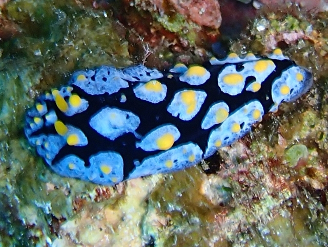 背面にひし形模様、周縁沿いに半円型の暗青色の模様が並び、