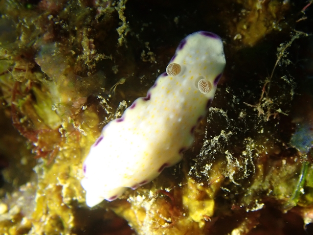 似ているコモンウミウシとは二次鰓の色で見分けます。