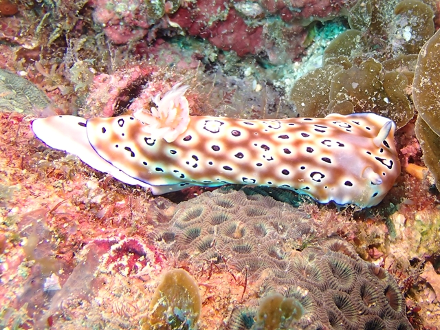 背面は茶褐色で、黒色の斑紋がヒョウ柄に散在します。