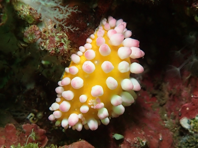突起の先端はピンク色、触角、二次鰓は白色です。