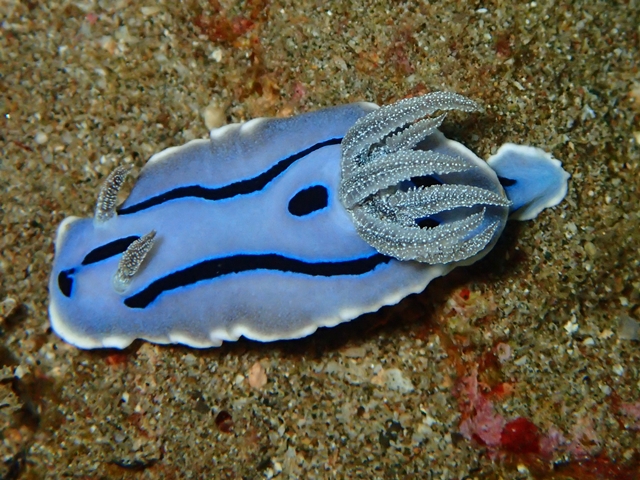 体長は3-5cm程度、外套膜周縁は白色の線で縁取られています。