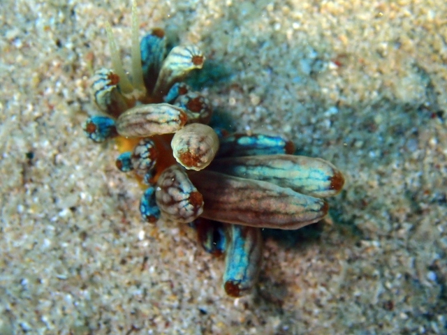 背面正中線上に白色の縦線が入ります。背側の突起は葉状、
